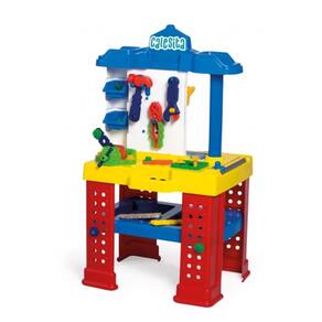 Bancada de trabalho com ferramentas para criar, montar e desmontar! Uma bancada com duas frentes de trabalho colorida e equipada com muitas ferramentas e acessórios! A brincadeira será montar e desmontar, parafusar e soltar parafusos e o que mais a imaginação quiser! O kit vem com alicate, chave de fenda, chave de boca, chave inglesa, morsa, serrote e furadeira que fazem barulho igual aos de verdade, martelo, parafusos e porcas.