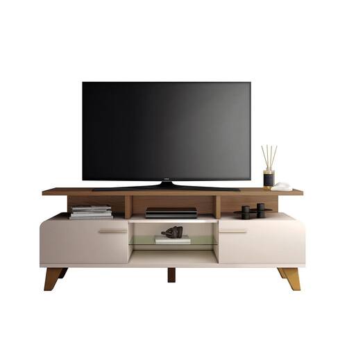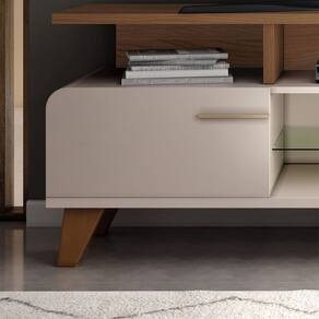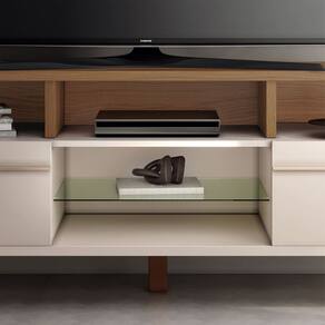 Observações: Ideal para TV de até 60” apoiada sobre a base; Cantos arredondados; 02 portas basculantes com pistão a gás; Prateleira de vidro 6mm; Puxadores metálicos em tom dourado; Pés de madeira maciça com acabamento envernizado; Produzida em MDP e MDF de 25mn e 15mm;