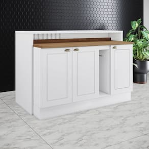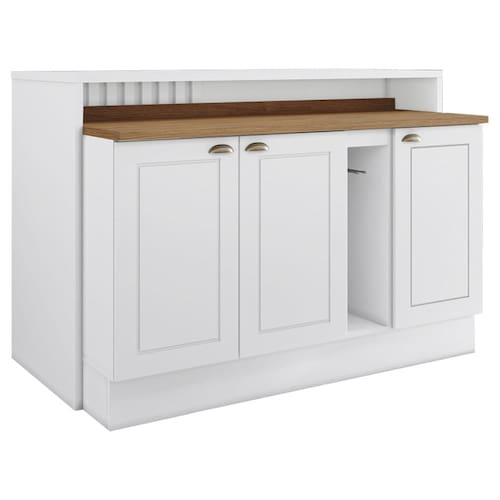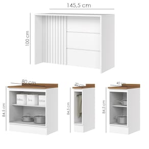 No conceito inspirado nas cozinhas estilo americano. Um conjunto modular de cozinha sendo 7 peças: 1 balcão de 80 cm (com tampo de 80 cm), 1 balcão de 40 cm (com tampo de 40 cm), 1 balcão de 20 cm (com tampo de 20 cm) e 1 Bancada gourmet de 145,5 cm. Todo o conjunto com estrutura feita 100% MDF de 15mm (fundo com 3mm, tampos em MDF de 25mm) , portas com dobradiças metálicas 35 mm com amortecimento e fechamento suave, total de 2 prateleiras espaçosas suportando até 8 kg. Cozinha com acabamento em pintura UV texturizada (fosco), portas e gavetas com detalhes de usinagem em baixo relevo, que proporciona beleza e facilidade ao limpar, além do destaque em seus puxadores em metal zamac. Este móvel chegará na sua casa separado em 07 volumes.