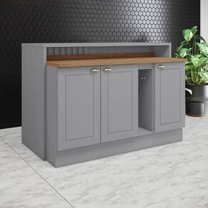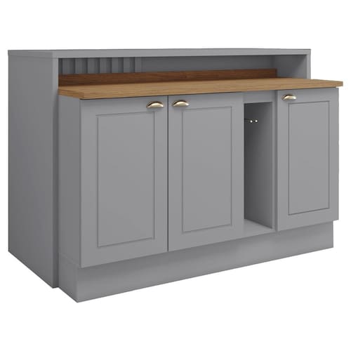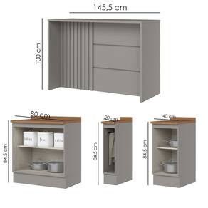 No conceito inspirado nas cozinhas estilo americano. Um conjunto modular de cozinha sendo 7 peças: 1 balcão de 80 cm (com tampo de 80 cm), 1 balcão de 40 cm (com tampo de 40 cm), 1 balcão de 20 cm (com tampo de 20 cm) e 1 Bancada gourmet de 145,5 cm. Todo o conjunto com estrutura feita 100% MDF de 15mm (fundo com 3mm, tampos em MDF de 25mm) , portas com dobradiças metálicas 35 mm com amortecimento e fechamento suave, total de 2 prateleiras espaçosas suportando até 8 kg. Cozinha com acabamento em pintura UV texturizada (fosco), portas e gavetas com detalhes de usinagem em baixo relevo, que proporciona beleza e facilidade ao limpar, além do destaque em seus puxadores em metal zamac. Este móvel chegará na sua casa separado em 07 volumes.