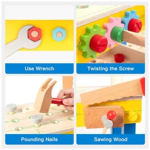 A Bancada Robud é feita de madeira maciça, garantindo uma construção robusta e durável. Sua superfície é lisa, sem rebarbas, e todos os cantos são arredondados para garantir a segurança das crianças. Fácil de montar, a bancada de madeira vem com seu próprio 'kit de montagem' em madeira, sem a necessidade de parafusos metálicos, porcas ou outras ferramentas reais. Seu filho pode tentar desmontá-la e remontá-la. Com cores vibrantes, esta bancada de madeira é altamente atrativa para crianças. Possui várias ferramentas de madeira simuladas para estimular a criatividade, como chave de fenda, serrote, martelo e parafuso. Ao brincar com esse brinquedo, as crianças usarão a imaginação, simulando diversas atividades. Outras crianças podem participar do jogo em grupo, sem brigas pelo brinquedo. Um presente incrível para ensinar crianças a usar ferramentas, adequado para qualquer ocasião como presente para meninos e meninas, garantindo diversão sem fim.