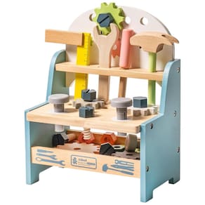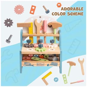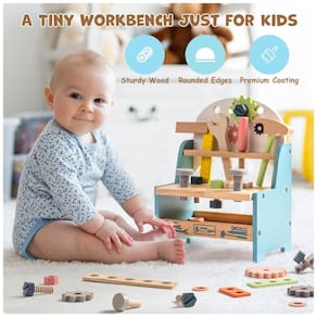 A Bancada ROBUD é feita de madeira maciça, garantindo durabilidade e segurança. Com design robusto, superfície lisa e cantos arredondados, evitando acidentes. Fácil de montar e desmontar, com prateleira para armazenar outras ferramentas. Rica em cores vibrantes, estimulando a criatividade das crianças. Inclui ferramentas de madeira como chave de fenda, serrote, martelo e muito mais. Ideal para brincadeiras de faz de conta, desenvolvendo a imaginação. Um presente educativo perfeito para ensinar as crianças a usar ferramentas, proporcionando diversão ilimitada.