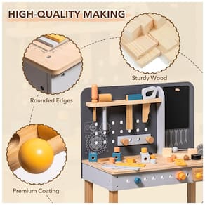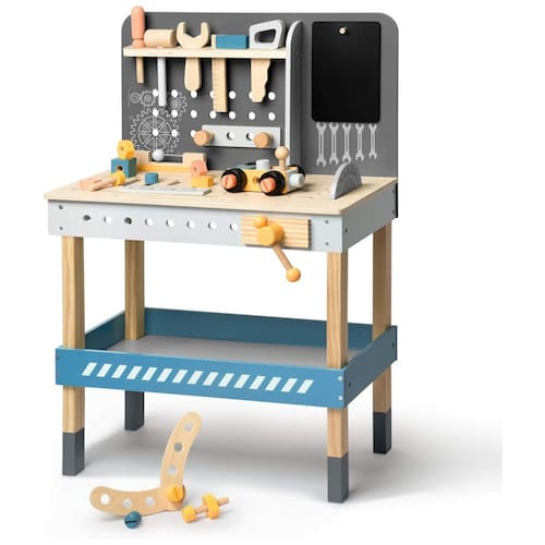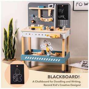 JOGO DE FAZ DE CONTA - Conjunto de construção de brinquedo realista para crianças, inclui um torno funcional, serra de mesa, quadro negro, conjunto de ferramentas de madeira, várias peças e ideias de projetos para estimular a imaginação. DIVERTIDA BANCADA DE FAZ DE CONTA - Ao brincar com este brinquedo, as crianças usarão constantemente a imaginação, se divertindo ao simular várias atividades. Outras crianças podem participar do jogo multiplayer, sem brigas pelo brinquedo. ORGANIZAÇÃO PRÁTICA - A bancada de madeira inclui prateleira de armazenamento conveniente e gancho para coletar todas as peças, incentivando as crianças a desenvolverem bons hábitos de organização de brinquedos. SEGURANÇA EM PRIMEIRO LUGAR - A Bancada Robud é feita de madeira maciça, com construção resistente e durável, superfície lisa sem rebarbas, design com cantos arredondados, prevenindo acidentes. ÓTIMO PRESENTE - Um bom brinquedo educativo para ensinar crianças a usar ferramentas, adequado para qualquer ocasião como presente para meninos e meninas, proporcionando diversão sem fim.