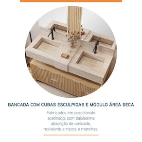 A Bancada para Banheiro é fabricada em porcelanato técnico polido. Possui baixíssima absorção de umidade e é resistente a riscos e manchas. Produto com furação de 32mm para fixação da torneira. Produto possui cuba esculpida em porcelanato, com válvula oculta cromada, já fixada na cuba. Acompanha cantoneiras de fixação na parede, parafusos e buchas de nylon. Acompanha frontão frontal e lateral. Bancada ideal para fazer composição com os ARMÁRIOS SUSPENSOS RIPY 120CM da BUMI MÓVEIS, bem como com as PRATELEIRA Ripy 120CM da BLU LAVATÓRIOS, (Vide no próprio Site Madeira Madeira em “Conjuntos de Porcelanato para Banheiro”). Produto sai montado de fábrica, basta apenas fixá-lo na parede e acompanha Manual de Instalação. Não acompanha torneira. Garantia de 12 meses para defeito de fabricação. Acabamento: Acetinado Acompanha Cuba: Sim Altura: 14,5 cm Ambiente Principal: Banheiro Cor: Travertino Cor da Cuba: Travertino Cor do Produto: Travertino Escala de Brilho: Acetinado Estilo: Moderno Garantia do Fornecedor: 12 meses Itens Inclusos: 02 Bancadas, 01 Modulo Área Seca, Frontão Frontal, Frontal Lateral, Parafusos, Buchas De Nylon E Manual De Instalação Largura: 124 cm Linha ou Coleção: Banheiro Manual de Montagem e Instalação: https://product-hub-prd.madeiramadeira.com.br/879591/documents/9e5a504d-e77f-4d27-a9cb-fe4ceaa05abc23435smartripy120esculpida.pdf Material da Cuba: Porcelanato Material Principal: Porcelanato Técnico Polido Medida da Cuba (C x L x P): 36x26,0x9,5cm Necessita Montagem: Não Origem do Produto: Nacional Peso: 36,8 kg Possui Prateleiras: Não Possui Sifão: Não Profundidade: 45 cm Recomendações de Uso, Manutenção e Limpeza: Para limpeza e conservação utilizar somente detergente neutro. Nunca utilizar qualquer tipo de cera. Não utilizar produtos abrasivos (esponjas de aço ou saponáceos). Suporta Até (kg): 10 Suporte para Toalheiro: Não