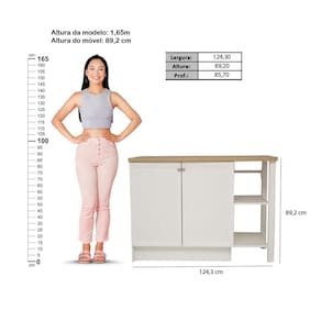 CARACTERÍSTICAS - Produzido em MDP de 15 mm com revestimento em pintura UV - A base superior suporta até 20 kg. - Possui prateleiras que suportam até 5kg. - Tampo padrão riviera em MDP, com revestimento em melamina, ideal para manipular alimentos. - Peso: 48,5 kg - Altura: 89,20 cm - Largura: 124,3 cm - Profundidade: 85,70 cm