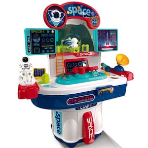 Feita com plástico de alta qualidade, a bancada é versátil e pode ser montada facilmente no estilo de uma estação espacial. Além de armazenar e transportar os acessórios com facilidade, ela conta com efeitos sonoros emocionantes, como luzes de lançamento de foguetes, alarmes, notificações e interfone. Para funcionar, o kit requer 2 pilhas "AA" de 1,5 V (não incluídas na embalagem).