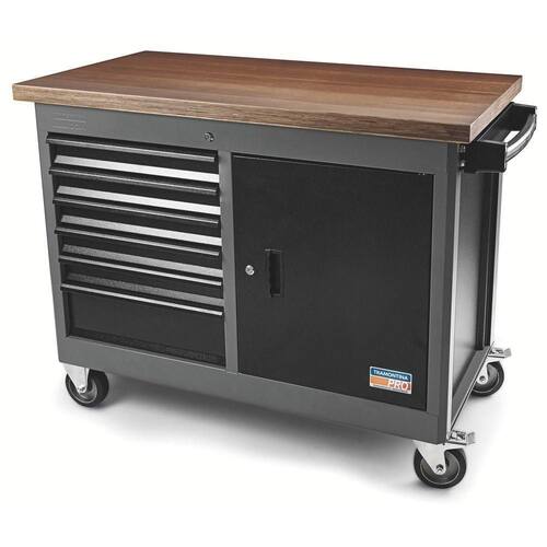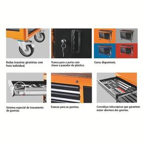 Tampo de madeira em compensado naval 40 mm. Estrutura com paredes reforçadas.Seis gavetas com corrediças telescópicas.Cinco gavetas com 75 mm de altura, uma com 155 mm e uma porta.Trancas para gavetas e porta.Rodas dianteiras fixas e traseiras giratórias.Rodas traseiras providas de freio individual.Capacidade de carga máxima por gaveta com altura de 75 mm: 20 Kg / com altura de 155 mm: 30 kg.Capacidade estática: 700 Kg, Capacidade dinâmica: 500 Kg.Espessuras das chapas - Corpo e gavetas: 1,2 mm.As maletas, carros e bancadas são testados em ensaios de carga, para garantir sua resistência durante a utilização na oficina ou indústria.A pintura eletrostática forma uma película protetiva que garante um acabamento excelente e resistência à corrosão.As gavetas que estão na linha de carros e bancadas, possuem corrediça tipo telescópica. - Armazenamento e transporte de ferramentas manuais, peças e acessórios.Puxador ergonômico.As ferramentas são produzidas e testadas conforme normas específicas.