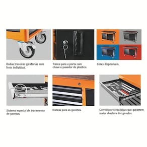 Estrutura com paredes reforçadas.Seis gavetas com corrediças telescópicas.8 gavetas com 75 mm de altura e 3 com 155 mm de altura.Trancas para as gavetas.Rodas dianteiras fixas e traseiras giratórias.Rodas traseiras providas de freio individual.Capacidade de carga máxima por gaveta com altura de 75 mm: 20 Kg / com altura de 155 mm: 30 kg.Capacidade estática: 700 Kg.Capacidade dinâmica: 500 Kg.Espessuras das chapas - Corpo e gavetas: 1,2 mm.As maletas, carros e bancadas são testados em ensaios de carga, para garantir sua resistência durante a utilização na oficina ou indústria.A pintura eletrostática forma uma película protetiva que garante um acabamento excelente e resistência à corrosão.As gavetas que estão na linha de carros e bancadas, possuem corrediça tipo telescópica. Armazenamento e transporte de ferramentas manuais, peças e acessórios.Puxador ergonômico.As ferramentas são produzidas e testadas conforme normas específicas.