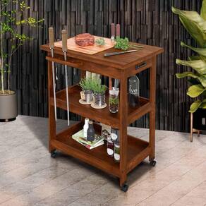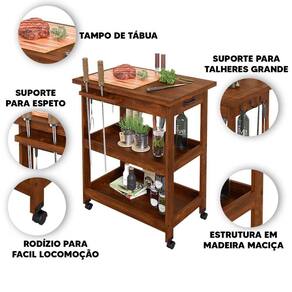 Apresentamos a Bancada Móvel com Acabamento Natural: feita em madeira maciça, durável e robusta. Seu acabamento com cera realça a beleza da madeira e a protege. Detalhes encantadores, com tábua de corte móvel, conferem charme ao ambiente. Com ferragens em metal e rodinhas para mobilidade, esta mesa une qualidade, elegância e praticidade.