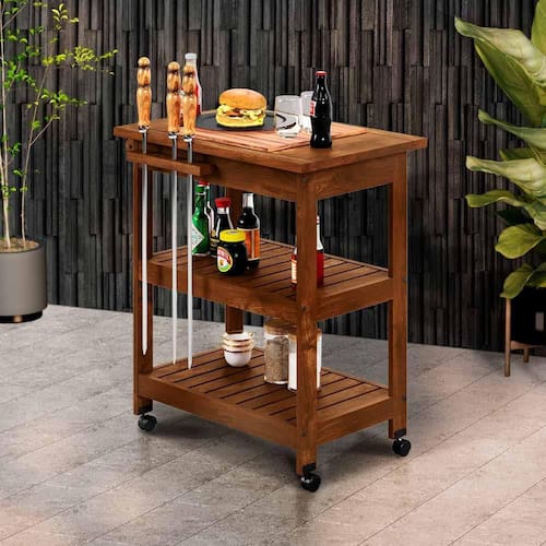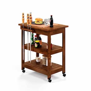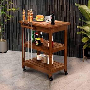 Apresentamos a Bancada Móvel com Acabamento Natural, feita em madeira maciça para durabilidade. Seu acabamento com cera realça sua beleza. Com detalhes encantadores, com tábua de corte móvel, a mesa agrega charme ao ambiente. Além disso, possui suporte para espetos, gaveta e porta toalha para praticidade. Com ferragens em metal e rodízios para mobilidade, é uma combinação perfeita de elegância e funcionalidade.