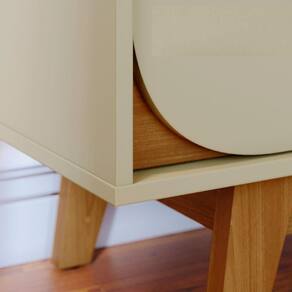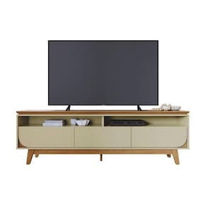 Três gavetas com corrediças telescópicas, gavetas laterais com detalhe curvo, tampo da TV suspenso em 25mm com borda chanfrada, pés usinados, painéis em MDP de 15 e 25mm.