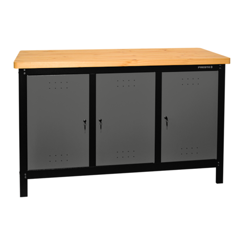 A Bancada Fechada 1,50m Dark da Presto foi desenvolvida para quem precisa de máxima robustez e organização em ambientes industriais e oficinas. Confeccionada em aço com colunas reforçadas, ela suporta trabalhos pesados com segurança e durabilidade. Seu tampo em pinus de 40 mm pode receber revestimento galvanizado (vendido separadamente), garantindo ainda mais resistência.