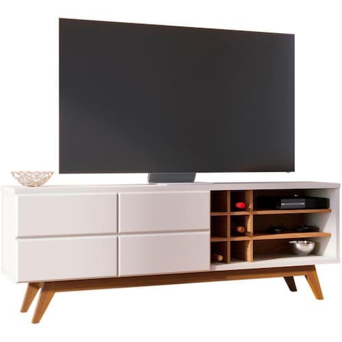 Bancada Rack Para TV 70 Polegadas Com Adega Noronha, uma excelente solução para compor seu ambiente, unindo elementos do design urbano e moderno que proporcionam uma ambientação intimista e aconchegante para sua decoração. Estrutura MDP de 15 mm e 25 mm, proporcionando resistência à peça e mais durabilidade, contando com pintura em acabamento UV/PU (Fosco). Composto por amplo tampo com espaço para TV, 2 portas com dobradiças metálicas, fecho toque e detalhes chanfrados que garante um visual clean ao móvel, adega com porta garrafas para até 6 unidades, 2 prateleiras que suportam até 2 kg cada, possibilitando a disposição de decorações e aparelhos eletrônicos, furação para passagem de cabos, e pés em madeira maciça. Suportando até 30 kg distribuídos, é ideal para TV de até 70 polegadas. Bancada Rack Noronha é um móvel multifuncional, ideal para compor salas de estar e home cinemas. Este móvel chegará na sua casa separado em 02 volumes.