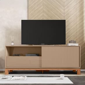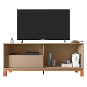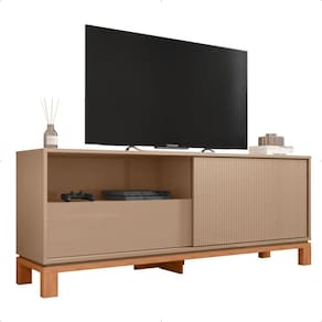MDP, HDFA Bancada Jace da Caemmun é a combinação perfeita entre design moderno e funcionalidade. Ofereceamplo espaço para acomodar sua TV de até 55 polegadas e outros eletrônicos. A gaveta proporciona organização e a porta de correr microrripada dá aquele toque de sofisticação. Seus pés cavalete com base elevada garantem um visual leve e contemporâneo, complementando qualquer ambiente.
