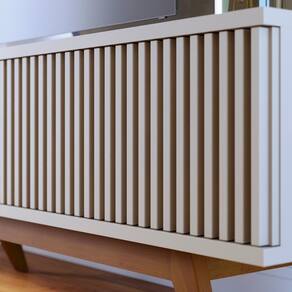 Bancada Rack TV 75 Pol 218 cm Fortaleza, um móvel para quem deseja ter um verdadeiro cinema em casa, unindo elementos do design moderno e contemporâneo, ideal para qualquer decoração. Estrutura em MDP de 15 mm e 25 mm, proporcionando resistência à peça e mais durabilidade, contando com pintura em acabamento UV (Fosco). Composto por amplo tampo com espaço para TV, 4 portas com dobradiças metálicas, detalhes artesanais ripados e prateleiras internas, proporcionando ótimo espaço de armazenamento para seus pertences, nicho central com prateleira para a disposição de eletrônicos e decorações, furações para passagem de cabos, e conta com 5 pés em madeira maciça. Suporta até 74 kg distribuídos, é ideal para TV de até 75 polegadas. Uma ótima opção para quem busca por um ambiente espaçoso e cheio de personalidade. Este móvel chegará na sua casa separado em 02 volumes.