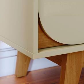 Três gavetas com corrediças telescópicas, gavetas laterais com detalhe curvo, tampo da suspenso em 25mm com borda chanfrada, pés usinados, painéis em MDP de 15 e 25mm.