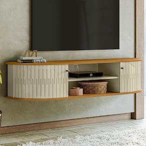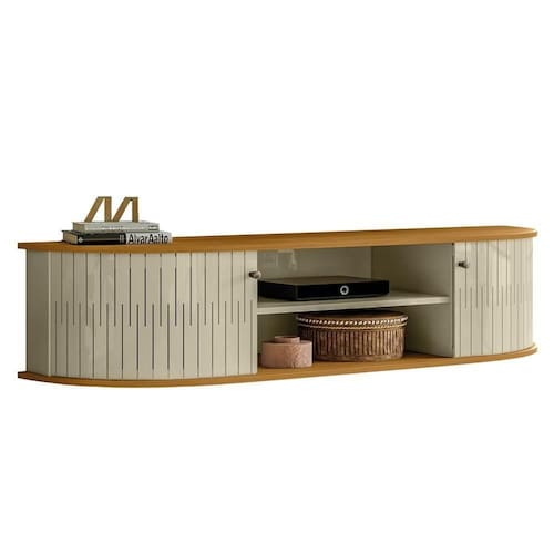 Visual retrô, portas deslizantes com frisos vazados e estrutura suspensa: o Modena é a escolha ideal para quem busca um rack moderno com toque vintage.