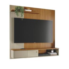 Porta deslizante, painel lateral e porta em MDF frisado (baixo relevo), puxador pontual dourado fosco, prateleira superior com borda frontal chanfrada, painéis em MDP de 15 e 25mm. Produto desenvolvido para ser fixado na parede. O televisor deve ser fixado no painel. Suporta TVs de até 65.