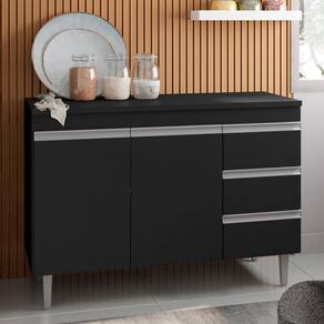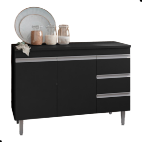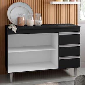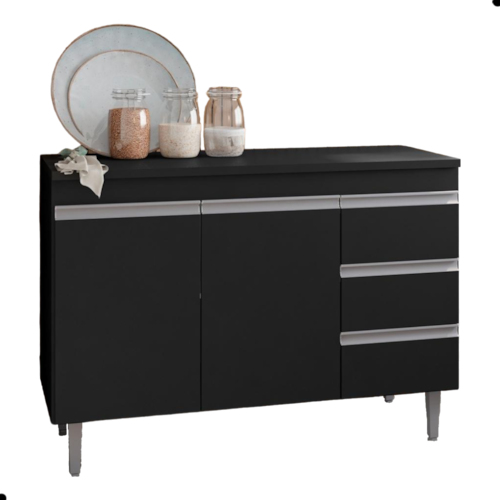 Possui 3 portas e 1 prateleira interna, 3 gavetas
