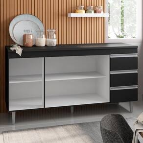 Possui 3 portas e 1 prateleira interna, 3 gavetas
