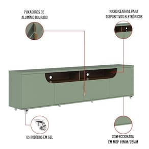 Transforme seu espaço de convivência com a elegância e funcionalidade da Bancada Karol. Com uma estrutura robusta e sofisticada, esta peça é confeccionada em MDP 15mm, MDP 25mm e HDF 3mm, garantindo durabilidade e qualidade excepcionais. A pintura UV na envolvente cor Verde Pistache/Amêndoa adiciona um toque de charme a qualquer ambiente. As duas portas com usinagem curva e as duas portas com puxadores de alumínio dourado e design curvo destacam-se pelo requinte e pela atenção aos detalhes. As dobradiças metálicas proporcionam um fechamento suave e seguro, garantindo praticidade no dia a dia. A Bancada Karol apresenta um nicho central perfeito para organizar seus dispositivos eletrônicos, enquanto o amplo tampo de 25mm oferece espaço suficiente para acomodar uma TV de até 75 polegadas com elegância e estabilidade. Os rodízios em gel conferem mobilidade à peça, facilitando sua movimentação e ajuste no ambiente conforme necessário. Seja na sala de estar, no quarto ou em qualquer outro espaço, a Bancada Karol é a escolha ideal para quem busca estilo, qualidade e funcionalidade em um único móvel. Adicione um toque de sofisticação ao seu ambiente com esta deslumbrante bancada!