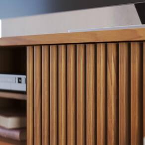 Quantidade de Portas: 1 Porta deslizante ripada Material dos Pés: Madeira Maciça