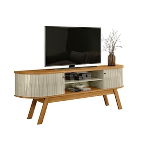 Características: Estrutura em MDP Pintura semi brilho Portas deslizantes em MDF Pés Retrô Puxadores de Plástico Base com detalhes curvos Espaço para TV até 75 Polegadas.