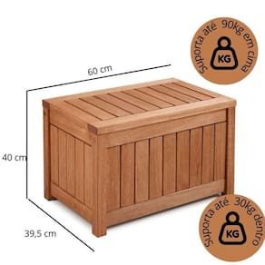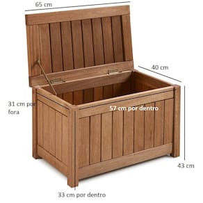 O Baú, ou Banco Baú produzidos em madeira maciça de eucalipto reflorestado são ideais para compor ambientes em áreas de lazer como sacadas, varandas, espaços gourmet ou churrasqueiras, áreas de lazer cobertas, ou ainda ambientes internos. Podem ser utilizado para guardar toalhas, objetos pessoais, brinquedos e o que mais você precisar guardar, e ainda tem a função de banco. Tem o tampo reforçado e com sistema articulado de abertura. Disponível nos tamanhos de 60,0 cm e 100,0 cm de largura para facilitar o preenchimento de pequenos espaços de seu ambiente. Ideal para combinar com os Pufes da linha Traço, que você poderá utilizar para realizar encontros rápidos. Seu design sugere um ambiente jovem e arrojado. Acabamento: Stain Acabamento dos Pés: Stain Altura: 40 cm Altura dos Pés: 3 cm Ambiente Principal: Varanda Complexidade da Montagem: Baixa: pode ser montado por uma pessoa sozinha Composição: 100% Madeira Maciça Cor: Stain Jatobá Cor do Produto: Stain Jatobá Cor Predominante: Bege Escala de Brilho: Fosco Estampado: Não Garantia do Fornecedor: 03 meses Informações Complementares: Ideal para varandas e churrasqueiras. Não recomendamos ficar exposto ao sol e chuva. Itens Inclusos: 1 Baú, ferragens e manual de montagem Largura: 65 cm Linha ou Coleção: Linha Combine Material dos Pés: Madeira Maciça Material Principal: Madeira Maciça Necessita Montagem: Sim Origem do Produto: Nacional Pés Reguláveis: Não Peso: 12,9 kg Possui Divisórias Internas: Não Possui Encosto: Não Possui Gavetas: Não Possui Pés: 04 Possui Rodízio: Não Profundidade: 39,5 cm Recomendações de Uso, Manutenção e Limpeza: Limpeza e cuidados: Passar um pano levemente umedecido com água, seguido de pano seco. Cuidados: Não utilizar produtos químicos ou abrasivos na limpeza. Evitar o contato com objetos cortantes. Resistente à Luz Solar: Sim Sapatas Niveladoras: Não