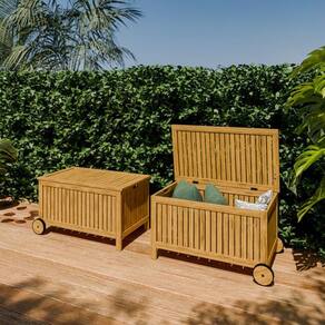 Este carrinho de apoio, modelo Bau, é ideal para organizar e transportar objetos em seu jardim ou quintal. Sua estrutura em madeira de alta qualidade garante durabilidade e resistência às intempéries, sendo perfeito para uso externo.
