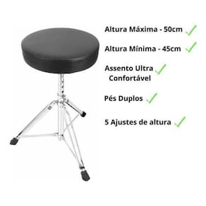 A estrutura do banco é reforçada, com espessura de tubo de 2,5 e 3,5cm, e acabamento cromado, que garante resistência e durabilidade mesmo após longos períodos de uso. Os pés são duplos e emborrachados, o que oferece estabilidade e firmeza durante as performances.