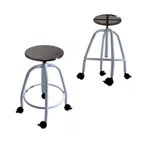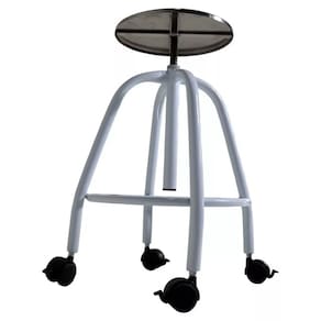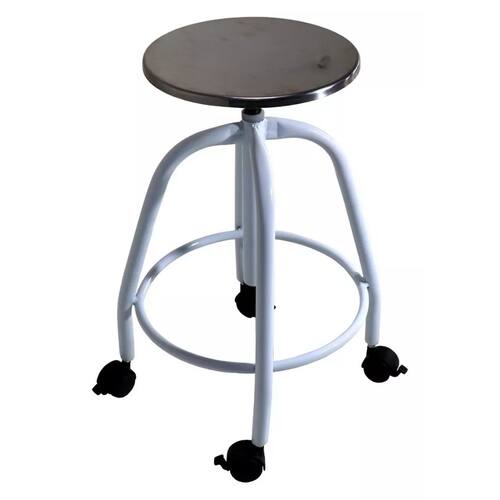 Especificação técnica: Estrutura em tubo redondo de aço carbono, com pintura eletrostática - Branca; Assento giratório em aço inox 201; Regulagem de altura, por eixo roscado; 04 rodízios de 2" (polegadas), sendo 02 deles com trava/freio instalados na diagonal.