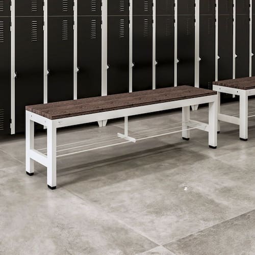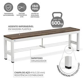 Com acabamento de excelência, é o banco ideal para academias, clubes e vestiários corporativos, este banco combina resistência e funcionalidade. Sua estrutura em aço perfil tubo 50x30 oferece durabilidade, enquanto o assento em madeira plástica impermeável garante higiene e fácil manutenção. A sapateira integrada otimiza o espaço, e as sapatas em polipropileno protegem o piso.