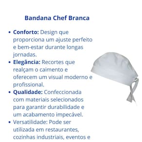 A Bandana Chef foi desenvolvida pensando em você, oferecendo o máximo de conforto no dia a dia com recortes que garantem uma modelagem perfeita. Ideal para quem atua na culinária, ela acrescenta elegância e qualidade ao uniforme, contribuindo para uma aparência sofisticada no ambiente de trabalho.