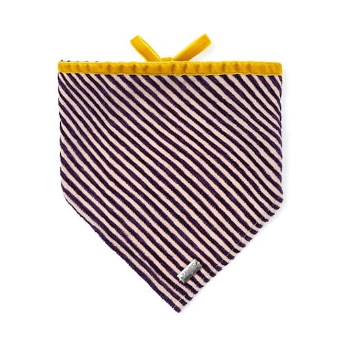 A Bandana Mila é feita em modelagem triângulo em tecido especial com listras em Chenille e amarração com fita de veludo francesa dupla face.