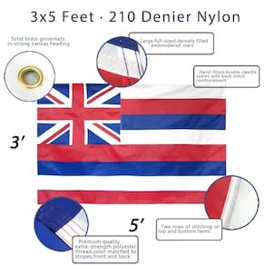 - Especificação - Importada. Feito de 100% nylon. O pacote contém uma bandeira do estado do Havaí bordada Anley de 3 x 5 pés
