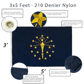 Esta bandeira pesada do estado de Indiana é feita de material de nylon durável para ajudar a resistir aos ambientes externos ventosos. Não compre uma bandeira de poliéster fino como papel que será arrancada em uma semana! Você apreciará plenamente o acabamento e a qualidade desta bandeira.