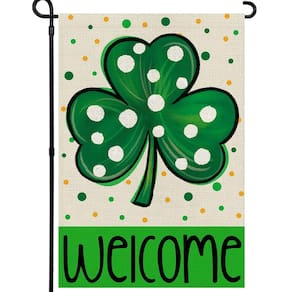 Charming Shamrock and Polka Dot Design Garden Flag: ótima aparência para seu jardim, quintal, pátio, alpendre ou varanda. O pacote inclui: 1 peça de bandeira de jardim (o suporte da bandeira não está incluído) Material: feito com poliéster de estopa durável, resistente às intempéries e ao desbotamento. Tamanho da bandeira: 12x18 polegadas
