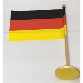 Bandeira de mesa da Alemanha dimensões: altura do mastro: 30 cm bandeira: 19 cm de comprimento x 14 cm de largura mastro: madeira de reflorestamento bandeira feita em poliéster Impressa frente e verso Marca: Mundo Das Bandeiras