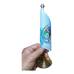 O mastro da bandeira é feito em liga metálica resistente, garantindo durabilidade e estabilidade. Com uma altura de 20 cm, ele é ideal para manter a bandeira em pé de forma elegante e firme. As dimensões da bandeira são de 9 x 13 cm, proporcionando um tamanho compacto que se encaixa perfeitamente em qualquer mesa.