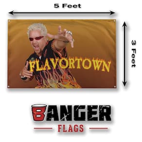 Esta bandeira decorativa chama atenção e oferece uma forma divertida e marcante de demonstrar seu apreço por Guy Fieri e sua famosa marca Flavortown. Medindo aproximadamente 91 cm por 152 cm, este tecido é do tamanho ideal para valorizar o ambiente de quartos de estudantes, espaços de lazer ou áreas recreativas. A imagem vibrante captura a personalidade energética de Guy Fieri com uma pose dinâmica e camisa temática de chamas, sobre um fundo em degradê quente que destaca o texto "Flavortown" em fonte estilizada e flamejante.