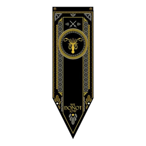 Adicione um toque de nobreza e autenticidade à sua coleção com esta bandeira flâmula da Casa Greyjoy de Game of Thrones. Fabricada em Tactel de alta qualidade, esta bandeira apresenta o brasão distintivo da Casa Greyjoy em uma dimensão de 150cm de comprimento e 48cm de largura.