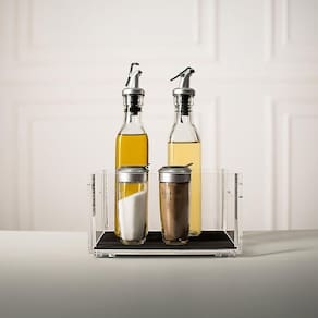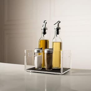 Fabricada em acrílico cristal de 5mm de espessura, essa bandeja é resistente e durável. Suas alças vazadas nas laterais facilitam o manuseio e adicionam um toque de estilo ao produto. Além disso, conta com revestimento em EVA preto lavável, que proporciona sofisticação e proteção aos seus temperos e condimentos.