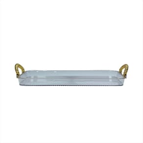Transforme seus momentos em verdadeiras experiências de luxo com esta bandeja sofisticada com alças douradas. Elegante e versátil, ela é perfeita para servir bebidas em ocasiões especiais, compor uma mesa refinada ou até decorar sua casa com charme e requinte. O design moderno aliado ao acabamento delicado valoriza qualquer ambiente, seja em recepções formais ou encontros descontraídos. Mais do que um item funcional, é uma peça de decoração que transmite bom gosto e estilo. Surpreenda seus convidados com a combinação ideal entre praticidade e sofisticação. Esta bandeja é o detalhe que faz toda a diferença na sua mesa posta Especificações Técnicas Material: PET 345g e PP 20g Medidas: 37,5cm x 26cm Alças: Douradas Metálicas com acabamento delicado Design: Transparente com detalhes texturizados Imagens ilustrativas. Marca: Não Informado