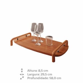 Bandeja Barcelona Decorativa Castanho com Detalhes em Metal Preto A bandeja Barcelona é versátil, pode ser posta para decorar e apoiar objetos sob móveis na sua sala de estar, sala de jantar, quarto etc. Além de agregar na decoração do ambiente. Pode ser utilizada para servir seus convidados em seus encontros sociais. Outra dica de uso, já que a bandeja possui uma estética mais formal, é em escritórios, também para servir ou apoiar materiais de trabalho. Especificações - Medidas do produto: 8,5 (A) x 29,5 (L) x 58(P) cm; - Cor: Castanho; - Com detalhes em metal preto; - Material: MDF Laqueado, Metal e Madeira Tauari; - Peso do produto: 2,15 kg. NA