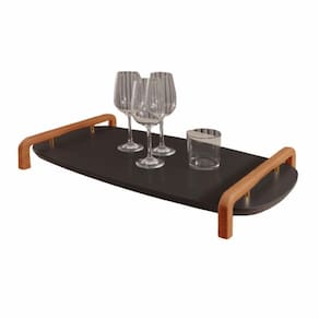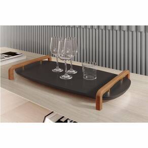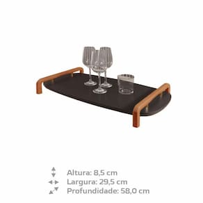 Bandeja Barcelona Decorativa Preto com Detalhes em Metal Dourado A bandeja Barcelona é versátil, pode ser posta para decorar e apoiar objetos sob móveis na sua sala de estar, sala de jantar, quarto etc. Além de agregar na decoração do ambiente. Pode ser utilizada para servir seus convidados em seus encontros sociais. Outra dica de uso, já que a bandeja possui uma estética mais formal, é em escritórios, também para servir ou apoiar materiais de trabalho. Especificações - Medidas do produto: 8,5 (A) x 29,5 (L) x 58(P) cm; - Cor: Preto; - Com detalhes em metal dourado; - Material: MDF Laqueado, Metal e Madeira Tauari; - Peso do produto: 2,15 kg. NA