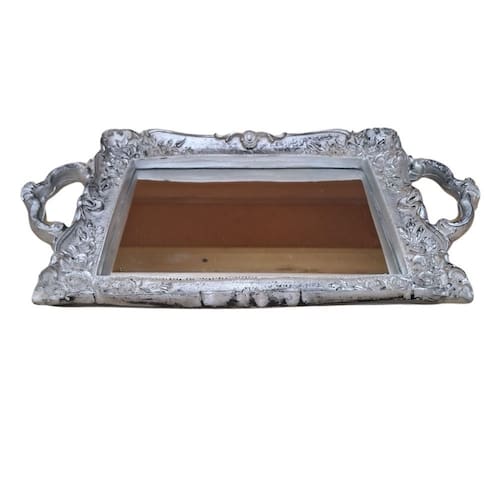 A bandeja com espelho e acabamento em flor de prata é uma peça decorativa que mescla funcionalidade com um toque de glamour.A borda é enfeitada com um delicado design em formato de flores, criando uma estética encantadora e atraente.O fundo espelhado reflete a luz e os itens dispostos sobre ele, criando uma sensação de amplitude e luminosidade. Isso também destaca os objetos posicionados na bandeja, tornando-a perfeita para exibir itens decorativos. Ideal para mesas de centro, cômodas ou pias de banheiro como um organizador elegante.