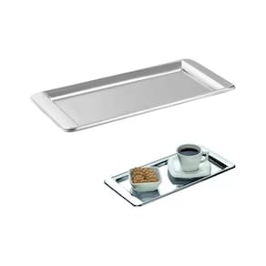 Design Sofisticado: Com seu formato retangular clássico e acabamento em prata inox, esta bandeja eleva a apresentação de qualquer prato ou item servido, impressionando seus convidados.