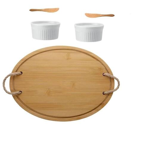 Bandeja de bambu com alça em corda 2 ramequin e faquinhas Linda bandeja com 2 Ramequins de ceramica e 2 colheres de bambu Belza ao servir, podem ser geleias, pates ou petiscos Tamanho:Bandeja: 33 X 23,9 X 1 CM Ramequin: 7,5 x 5,5 cm as nores, podem sewr diversas conforme a disponibilidadeFaquinhas de bambu para patês : 8cm Materials:Bandeja bambu com alça em cordaMini Bowl em certamica de qualidade, delicadosColheres em BambuTemos 3 cores de ramequins serão enviados 2, todos muito bonitos, branco, preto ou vermelho.