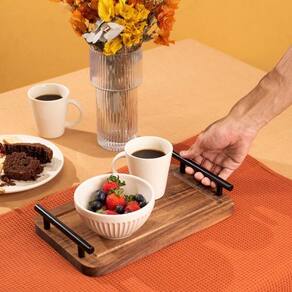 Multiuso: pode ser usada para servir comidas e bebidas, organizar objetos ou exibir itens de decoração.Versátil: combina com diversos ambientes, como cozinha, quarto, sala e banheiro.Prática: alças de metal oferecem mais suporte ao manuseio e transporte, ideal para servir um café da manhã especial.Decorativa: o tom natural da acácia adiciona um toque rústico e elegante aos ambientes.Resistente: feita em acácia, com um tom marrom caramelado que destaca sua durabilidade e beleza.