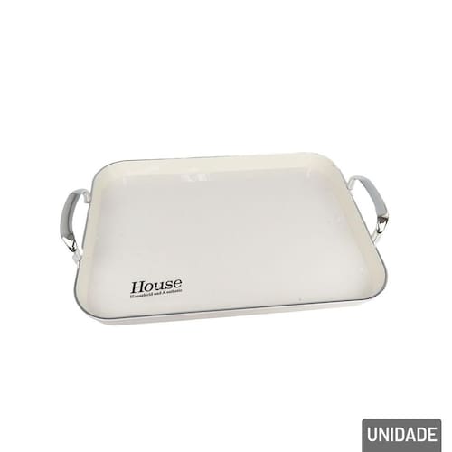 Bandeja de Plástico 46,5x30cm Retangular com Esta Bandeja de Plástico Retangular, com 46,5x30cm, é a escolha perfeita para quem busca praticidade e estilo em um único acessório. Feita de plástico resistente, ela garante durabilidade e facilidade de uso no dia a dia. Na elegante cor branca, a bandeja transmite um visual clean e sofisticado, enquanto as alças prata adicionam um toque de sofisticação e modernidade, facilitando o transporte. Com a frase inspiradora "Household and Aesthetic", ela traz uma mensagem de elegância e funcionalidade para o seu lar. Perfeita para servir, organizar ou decorar, esta bandeja é uma peça versátil que combina beleza e praticidade em qualquer ambiente.\nEspecificações:\nMarca : TINGS\nTipo de material : Plástico\nCores ou Estampa : Branco, Prata\nDimensões do Produto : 6,5 X 46,5 X 30,5 CM\nDimensões da Embalagem : 3,5 X 43 X 30,5 CM\nPeso Bruto (Gramas) : 0.472 Marca: Não Informado